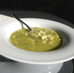 Temu dodamo mezgo in zelenjavno kocko ter vse skupaj dobro premešamo. Zalijemo z vodo in pustimo nekaj minut, da zavre. V to dodamo grah iz pločevinke in olive, začinimo po okusu.