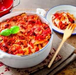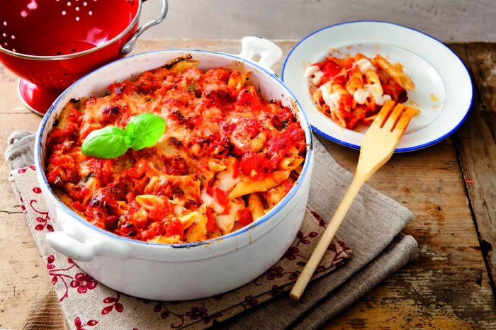 Mocarelo narežemo na rezine. Kuhane testenine odcedimo in jih stresemo v rahlo namaščen pekač.
