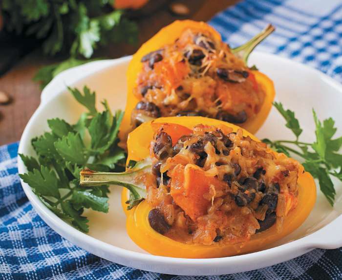 4 mesnate rumene paprike, 3 žlice kokosovega olja, 1 majhna drobno sesekljana čebula, 3 strti stroki česna, 3 majhne olupljene in na kocke narezane bučke, 2 olupljena in na kocke narezana paradižnika, 100 g kuhanega rdečega fižola, 50 g nastrganega sira (na primer gavde), 1 žlica sesekljanega svežega peteržilja, 1 žlica sesekljane sveže bazilike, 1 osmukana vejica svežega timijana, pol žličke soli, pol žličke zmletega črnega popra.