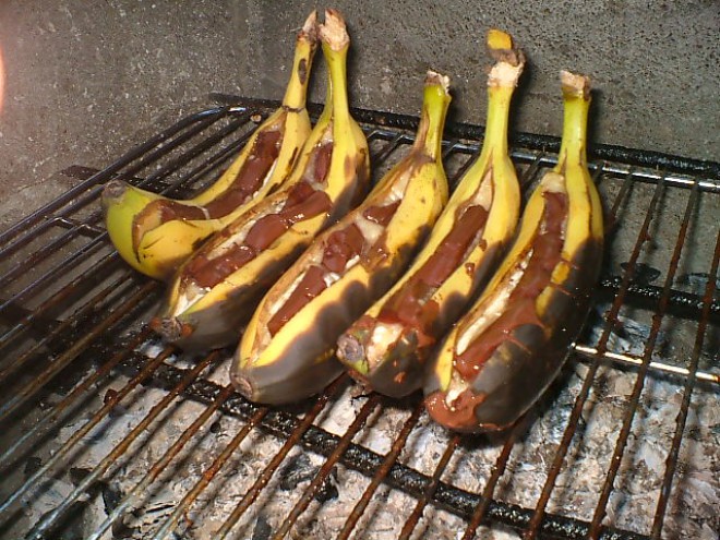 Banane prerežemo vzdolž tako, da vanjo vrežemo z jedilnim nožem ravno toliko, da bomo lahko po celi dolžini vanjo vstavili rozine in čokolado, nikar pa preveč, da nam ne razpadejo. Vzdolž zareze vanjo natlačimo namočene rozine in koščke čokolade (3 ali 4 na banano).