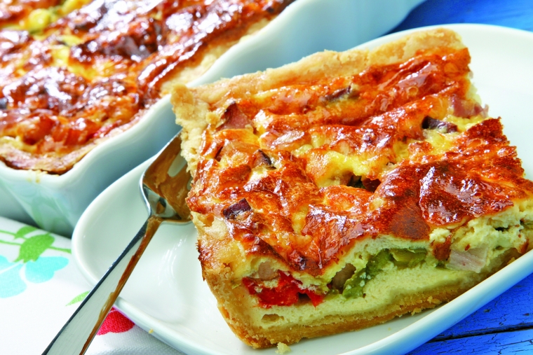 Pečico ogrejemo na 190 stopinj. Jajca in moko dobro zmešamo, solimo, nato med mešanjem prilijemo mleko. Testo najprej potresemo s parmezanom, obložimo s prepraženo slanino in ohlajeno papriko ter prelijemo z jajčno zmesjo.