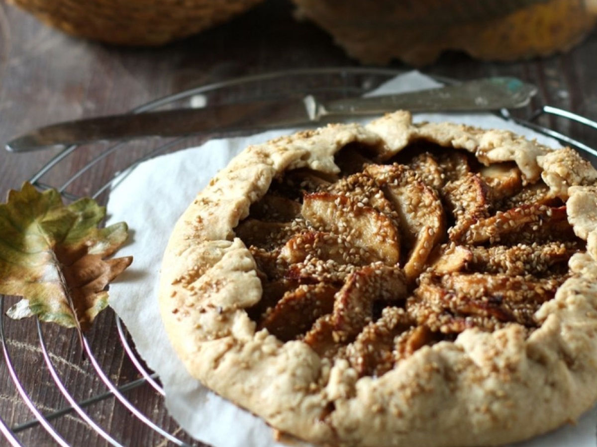 Medtem zvaljamo testo v obliki kroga. Pri strani pustimo 1,5 cm roba, po sredini pa naložimo jabolka (če ostane na dnu mariniranih jabolk kaj soka, ga polijemo čeznje), posujemo še z žlico sladkorja in preostalo polovico sezamovih semen. Robove testa zavihamo navznoter, proti sredini. Po želji po robu potresemo še malo grobega sladkorja in sezama.