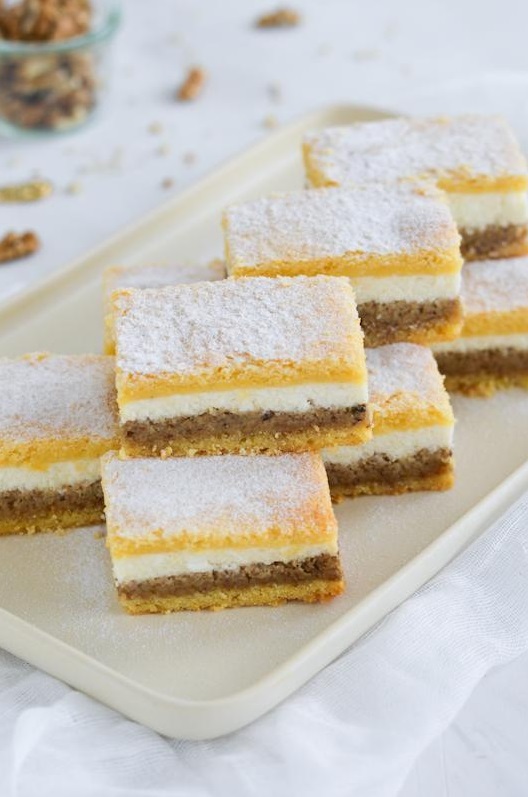 Na dno pekača damo najprej eno plast testa, sledi orehov nadev, nato skutin in na vrhu še ena plast testa.