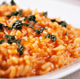 Dodamo riž, počakamo, da postekleni, nato nasekljan paradižnik. Ko izhlapi sok, po zajemalkah med prilivamo jušno osnovo, vsakič mešamo in čakamo, da tekočina izhlapi. Skuhamo klasično italijansko rižoto.