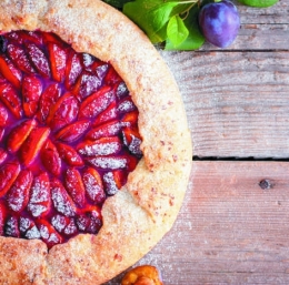 Testo oblikujemo v kepo, ki jo sploščimo in med dvema kosoma papirja za peko razvaljamo v 3 mm debel krog s premerom 30 cm. Za 30 minut damo testo v hladilnik. Medtem operemo slive in jih dobro odcedimo. Razpolovimo jih in izkoščičimo. Pomešamo jih s preostalim sladkorjem in praškom za želiranje.