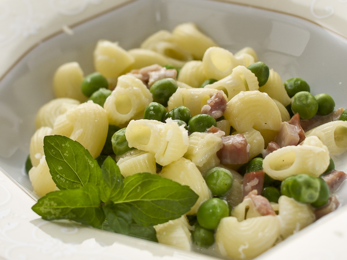 – 100 g slanine v kosu – 400–500 g majhnih testenin – oljčno olje – glavica mladega česna – 300 g oluščenega mladega graha – 4 dl vode ali zelenjavne jušne osnove – 5 žlic kisle smetane – sol, parmezan – sveža meta – lupinica eko limone