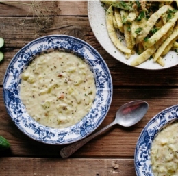 6. Kumaram dodamo pire in razredčimo z mlekom, da dobimo gosto omako. Če je pregosta, prilijemo malce juhe. Ne pozabimo na kis, saj je pika na i v tej jedi. Začinimo še s koprom in poprom.
