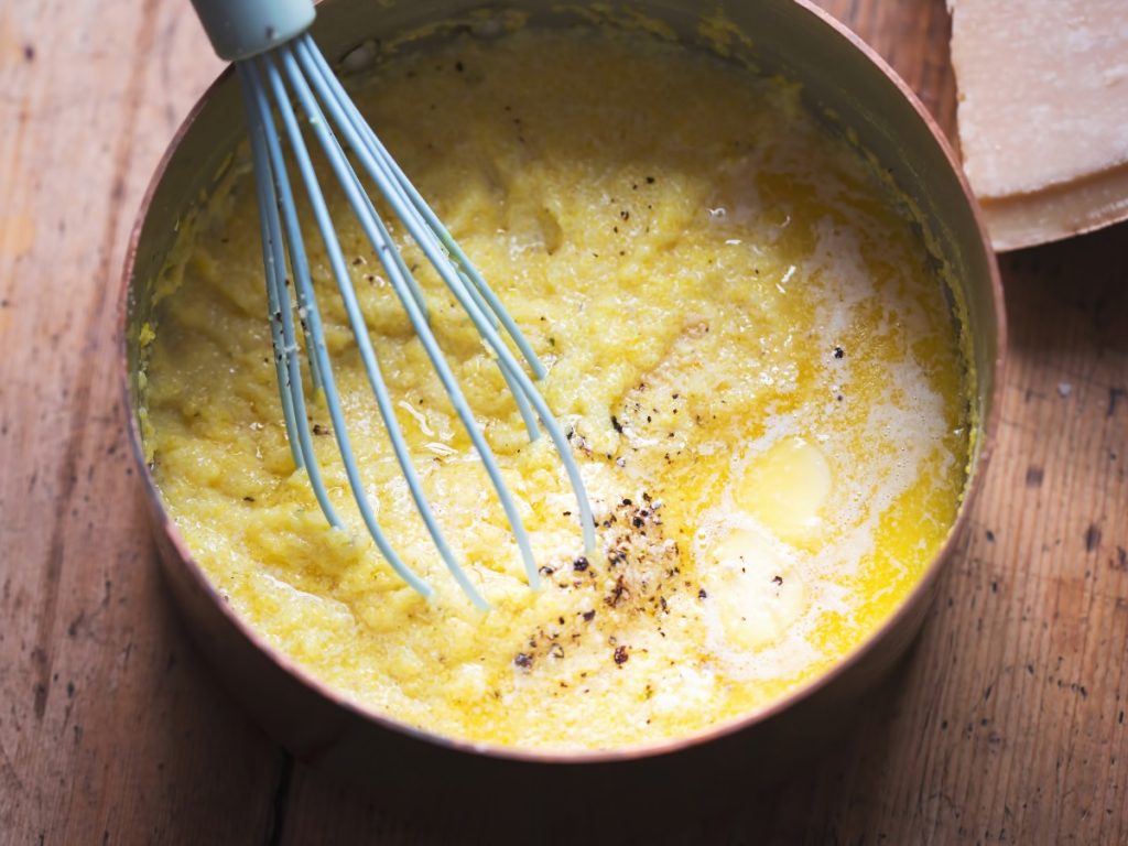 1. Pečico segrejemo na 200 stopinj Celzija. Pekač (za lazanjo) premažemo z maslom. Ohlajeno polento narežemo na rezine in jo na pekač položimo tako, kot bi kolobarje krompirja polagali za musako. Rahlo solimo in popramo.