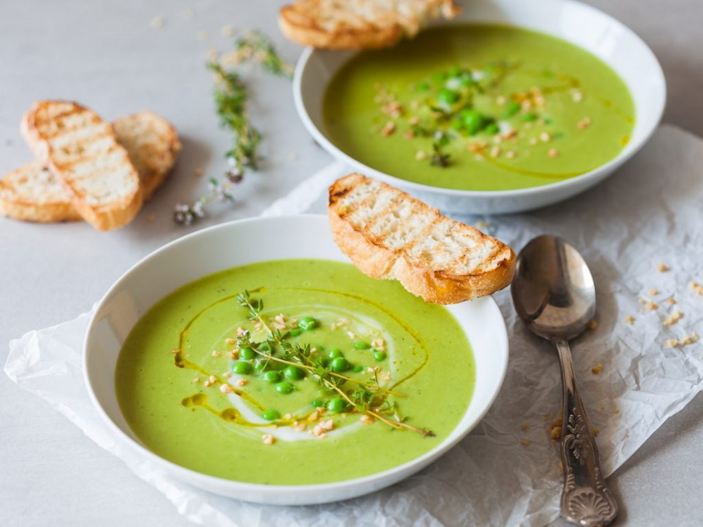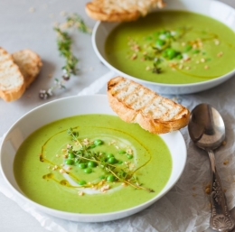 4. Juho vlijemo v krožnike in dekoriramo z rastlinskim jogurtom, pokapamo z oljčnim oljem, dodamo žlico blanširanega graha in vejico timijana ter postrežemo.