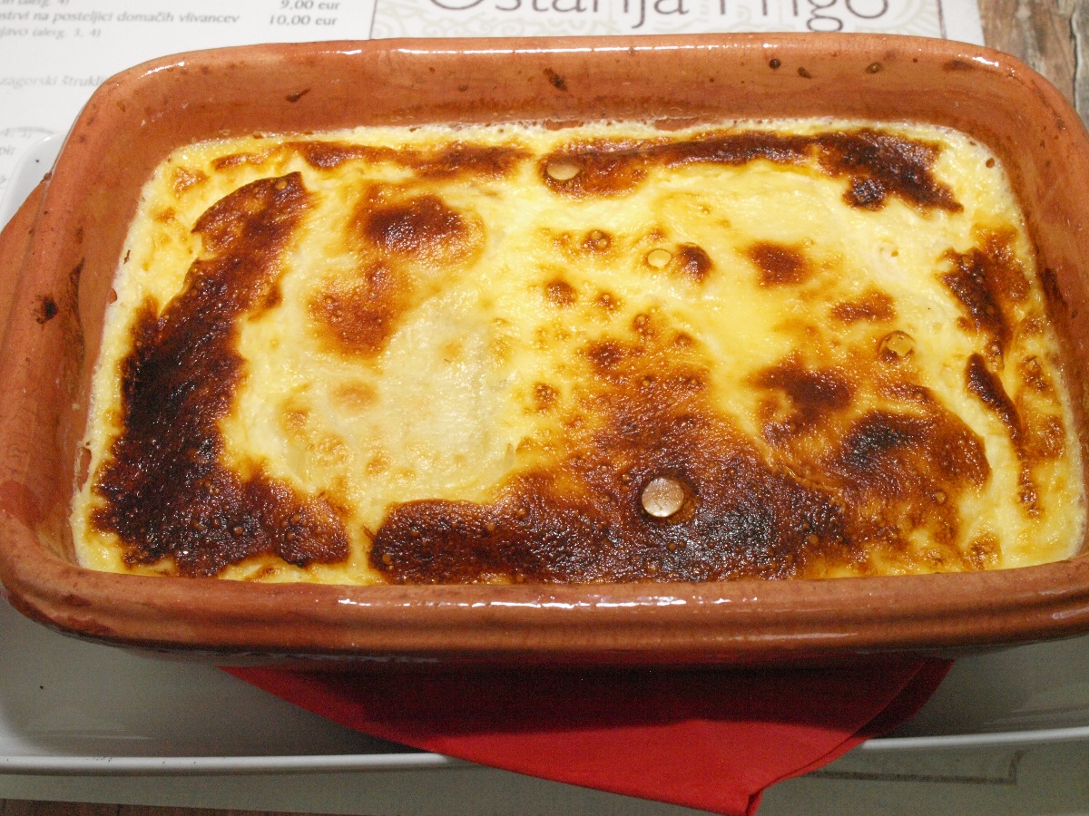 Tega razdelimo na manjše kose in jih zložimo v pomaščen pekač. Pečico segrejemo na 210 stopinj Celzija in štruklje pečemo 10 minut, nato jih prelijemo s smetanovim prelivom in pustimo še 10 minut, da dobijo lepo rjavo barvo. Najbolje je, da jih pečemo v lončeni posodi.