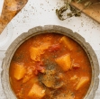 2. Na deski narežemo meso na podobno velike kose kot zelenjavo in prav tako stresemo v lonec. Prilijemo olje, pristavimo in začnemo pražiti, približno 5 minut. Solimo, začinimo z origanom, timijanom, lovorjem.