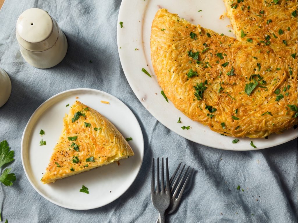 3. Nato na ponev poveznemo velik krožnik ali ravno pokrovko, ponev dvignemo in frtaljo zvrnemo na krožnik. Vrnemo jo v ponev in spečemo še po drugi strani, približno 5 minut. Pečeno damo na krožnik in narežemo na trikotnike. Ponudimo z zeleno solato s koruzo.