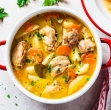 2. Zavremo, dodamo začimbe in šampinjone ter pokrijemo. Na majhnem ognju kuhamo dvajset minut. Dodamo sir in mešamo, dokler se ne stopi. Nadevamo v skodelice in okrasimo z baziliko, po želji potresemo s sirom.
