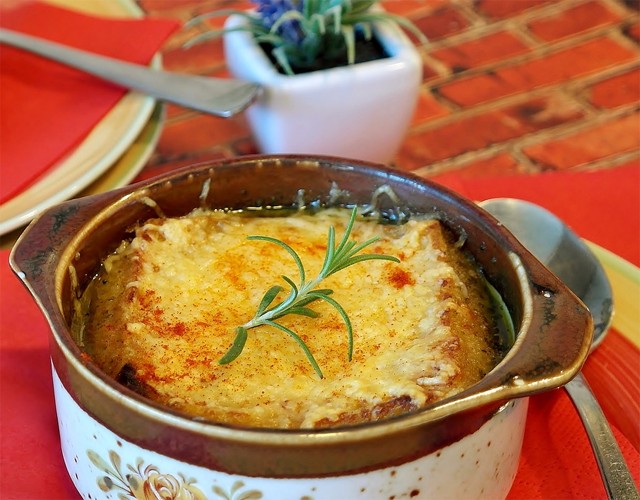 3 velike čebule, veliko žlico masla, 2 žlici olja, 2 veliki žlici moke, kocko piščančje jušne osnove, žličko sladkorja, žličko soli, 12 rezin kmečkega kruha in 120 gramov naribanega ementalca ali grojerja.