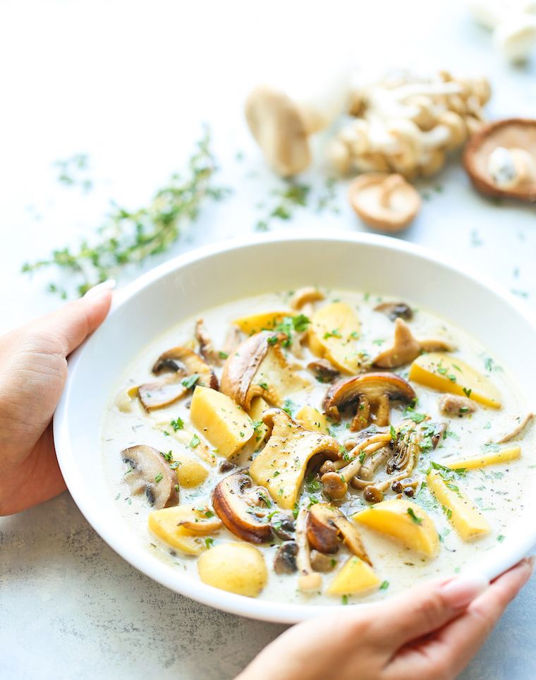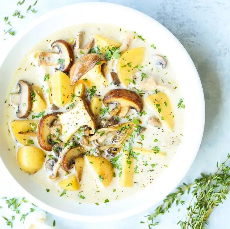 750 g drobnega krompirja 3 šalotke 650 g očiščenih mešanih (gojenih) gob 3 žlice gladke moke 45 g masla 0,9 dl sladke smetane, 36–40 % 0,9 dl polnomastnega mleka 1,2 dl suhega belega vina pribl. 1 l piščančje osnove sol beli poper v zrnu 2 žlici sesekljanega peteršilja 3 stroki česna 6 vejic timijana 2 lovorova lističa