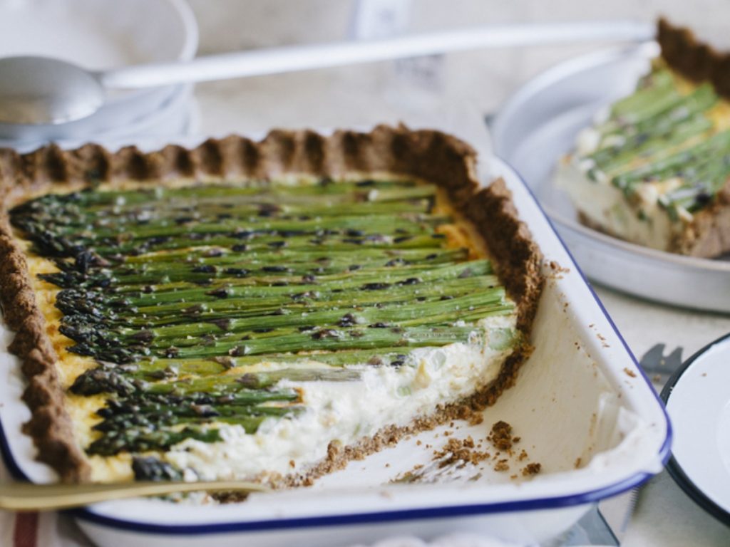 – slano testo za pite – 300 g maskarpone, 250 g rikote ali albuminske skute – 100 g kisle smetane, 4 jajca, 400 g svežih špargljev – vejica timijana, vejica origana, sok pol limone, sol in poper