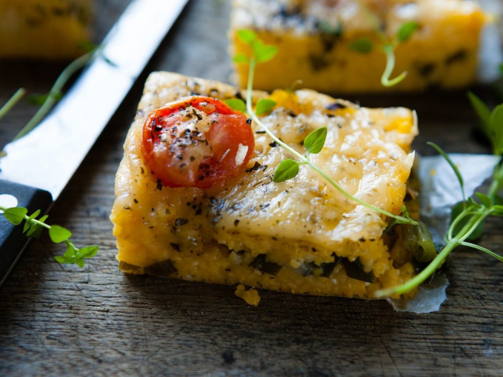 – 200 g polente – šopek špargljev – 1 žlica masla – 10 dag svežega sira ali fete – oljčno olje, sol, poper – šopek peteršilja – češnjev paradižnik