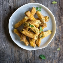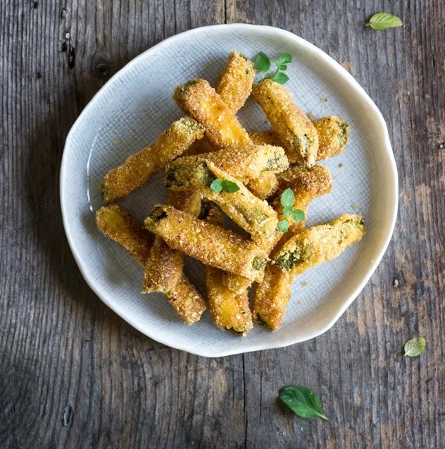 Prvo bučkino palčko povaljamo po moki. Blago jo otresemo in potopimo v jajca. Nekoliko odcejeno povaljamo po koruznem zdrobu. Odložimo jo v pekač in podobno paniramo preostale. Bučkine palčke so še bolj hrustljave, a manj zdrave, ocvrte v globoki maščobi.