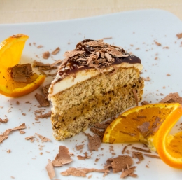 Nato jo premažemo s slivovo marmelado in okrasimo z rezinami pomaranč, preostalimi koščki marelic in nastrgano čokolado.