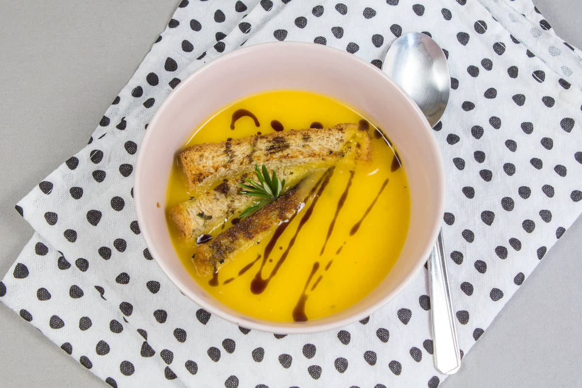 Nato bučno juho zmiksamo s paličnim mešalnikom, prilijemo skodelico pomarančnega soka, premešamo in juho kuhamo še 2 minuti.