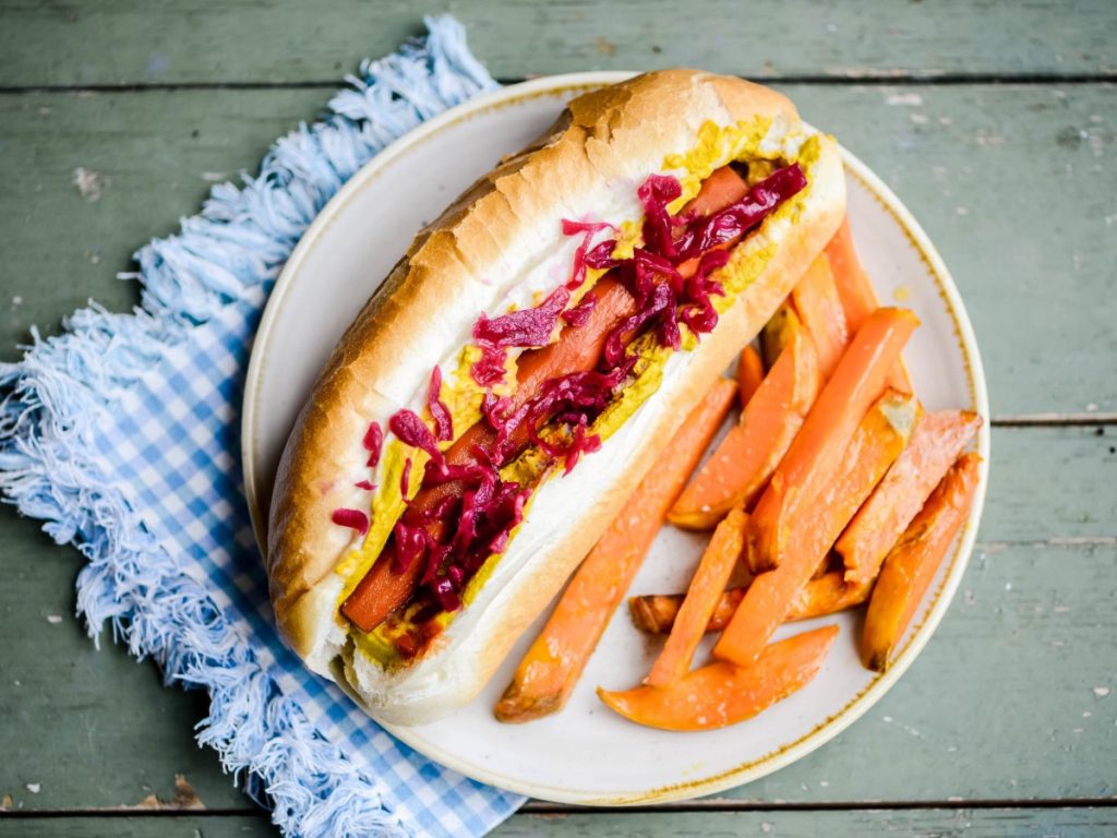 3. Preden hot dog sestavimo, korenčke pogrejemo v marinadi. V prerezani štručki jim dodamo gorčico, kar bo še poudarilo okus. Po želji hot dog dopolnimo z majonezo, vloženo zelenjavo, odlične so drobne čebulice ali rdeče kislo zelje. Ponudimo s pomfrijem iz sladkega krompirja.