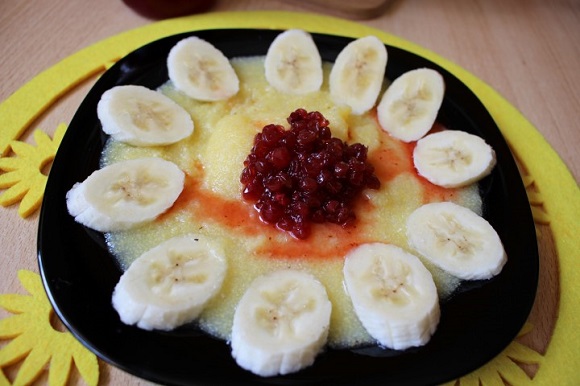 Kuhano polento damo na sredino krožnika, obložimo z rezinami banane in jih posujemo s cimetom. Na sredino polente damo marmelado po želji.