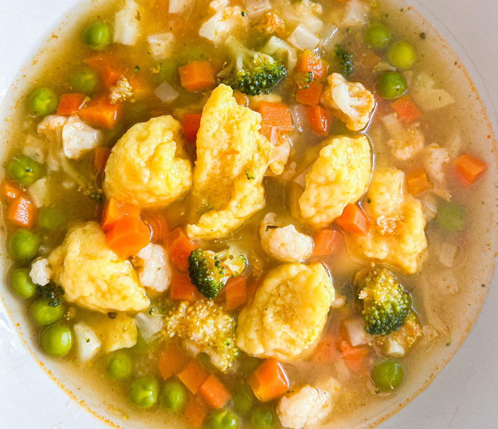 - zelen po želji (korenček, grah, krompir, cvetača, brokoli, malo zmrznjene špinače, koruza, bučke …)