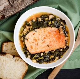 5. Počasi naj vre kakšnih dvajset minut do pol ure. Ko je ohrovt kuhan tako, kot vam je všeč, dodajte kuhan bel fižol, česen in paradižnik, po okusu solite, poprajte in okisajte z limonovim sokom. Enolončnica naj ponovno zavre.