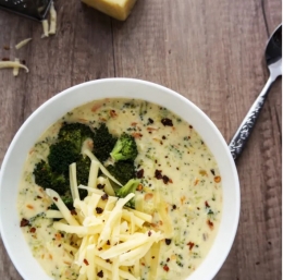 Uživaj: Juho serviraj v skodelico, okrasi s prihranjenim brokolijem in sirom, potresi s čilijevimi kosmiči ter takoj postrezi.