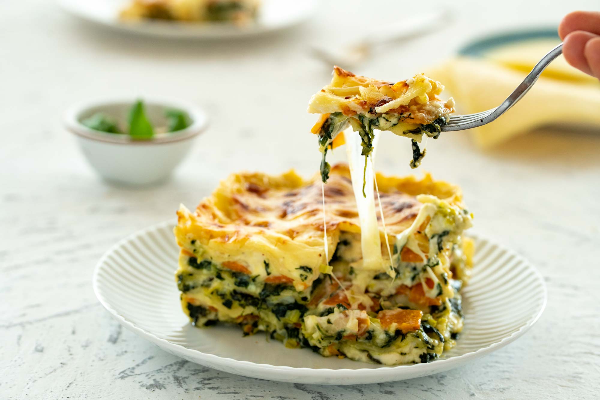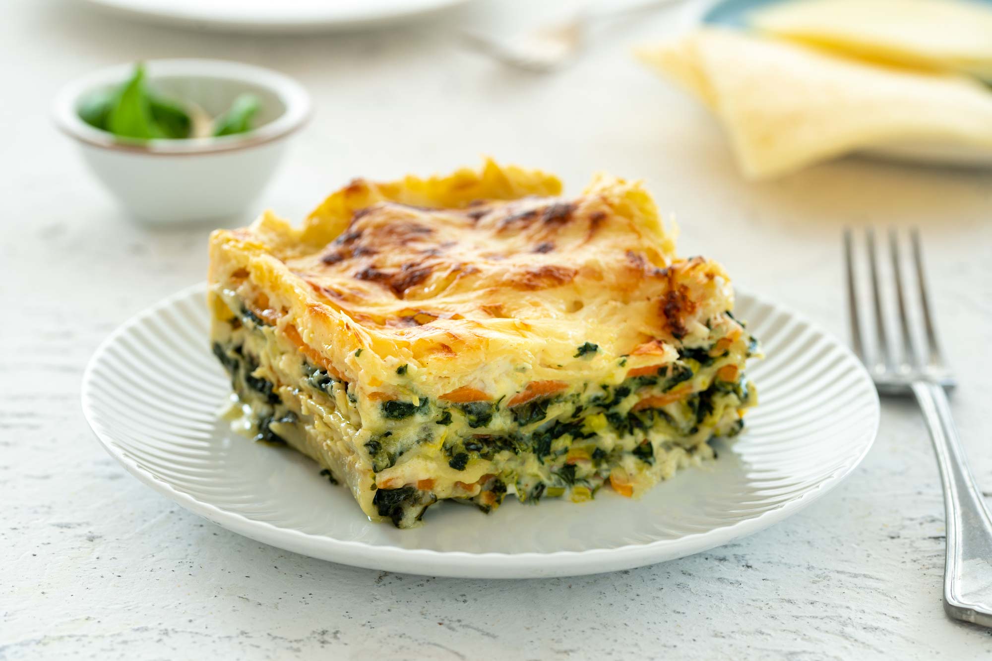 200 g testenin za lazanjo 30 g moke 30 g masla 600 ml mleka 1 lovorjev list ⅛ žličke muškatnega oreščka 50 g naribanega sira gauda 500 g sveže špinače 100 g pora 3 stroki česna 300 g korenja 180 g mozzarelle v lističih 60 g naribanega sira tilzit Olivno olje Sol in poper