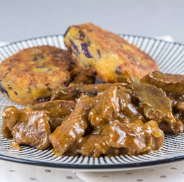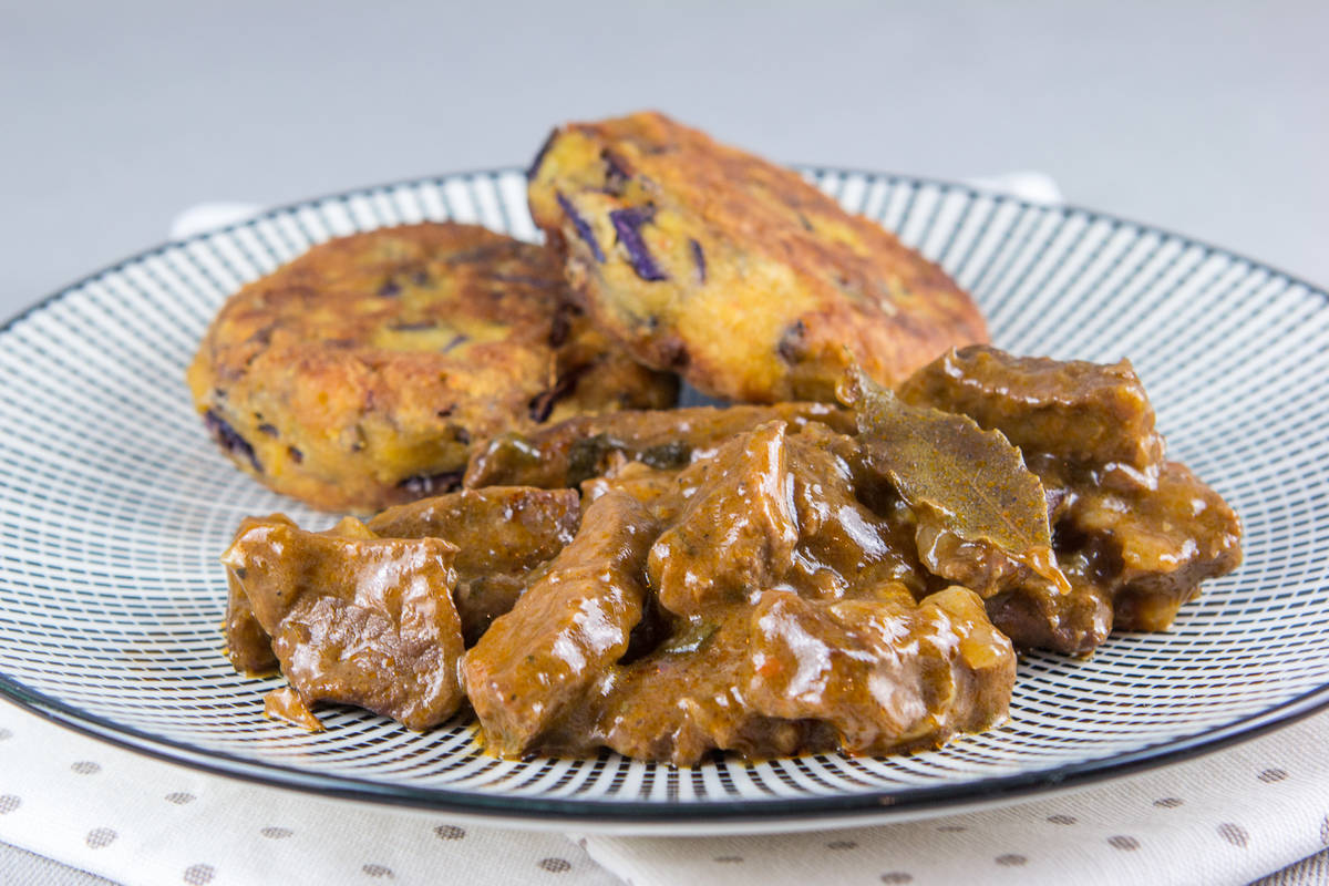Sestavine 25g Maslo 2 kosa Čebula 6 strokov Česen 3 žlice Pšenična bela moka 600g Govedina - file 2 žlici Olje - olivno 3 kosi Lovorov list Poper 400ml Vino - rdeče 1 žlica Paradižnik - mezga 300ml Zelenjavna juha