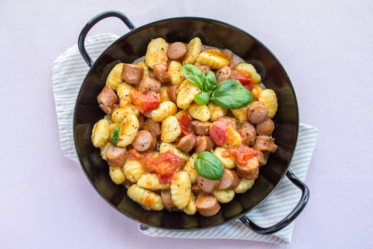 Sol 500g Njoki 4 kosi Hrenovke 1 žlica Olje - olivno 6 kosov Paradižnik - svež Poper Bazilika