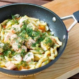 360 g peresnikov 200 g lososa 15 g sesekljanega česna 4,5 dcl sladke smetane olivno olje koper, peteršilj sol, poper