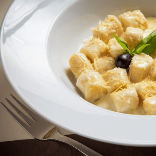 V skutno zmes s kuhalnico najprej vmešajte nariban parmezan, za tem pa še moko. Ko se sestavine povežejo oziroma združijo in dobite testo, ga na rahlo pomokani delovni površini razvaljajte in razrežite na več manjših kosov, iz katerih naredite daljše svaljke, ki jih nato s topim nožem narežite na njoke.