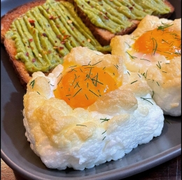 Sestavine 2× Jajce 2 žlici Parmezan 1 žlica Drobnjak Slanina Pečen paradižnik Avokado Toast kruh