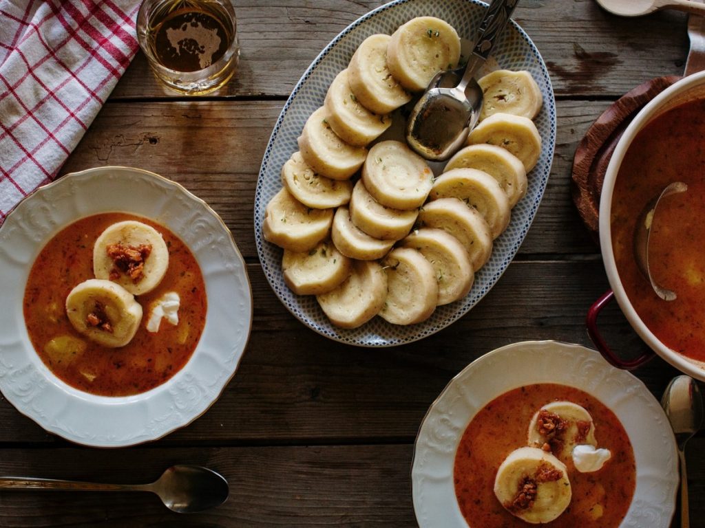 8. Slastno krompirjevo juho postrežemo s skutnimi štruklji, zabelimo z ocvirki in dodamo dobro žličko kisle smetane.