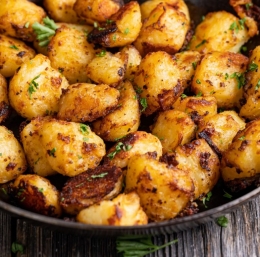 Namig: Če krompirček pečemo sočasno s svinjsko potrebušino, posteljico z njeno maščobo prihranimo, potrebušino postavimo na sredino pekača, okoli nje pa razporedimo krompir. Tako pečemo 30 minut, nakar iz pekača vzamemo meso, prilijemo pa za nekaj žlic prihranjene maščobe in previdno, a dobro premešamo. Do konca pečemo še 20–30 minut.