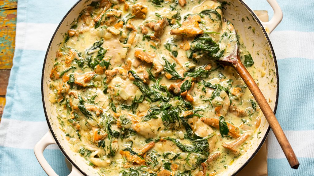 KUHINJA.COM | Piščanec z lisičkami in špinačo v smetanovi omaki ...