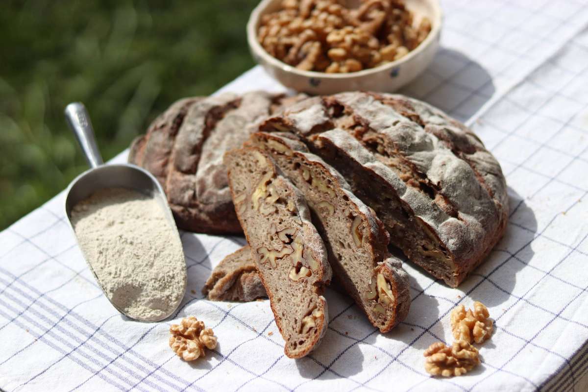 1. Ajdovo moko poparimo z vrelo vodo (370 ml), dodamo sol, premešamo s kuhalnico in pustimo, da se ohladi na sobno temperaturo. Medtem v ponvi ali pečici nekoliko segrejemo orehe, a le toliko, da zadišijo. V drugi posodi raztopimo kvas v preostali vodi (120 ml) in dodamo 10 g sladkorja.