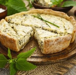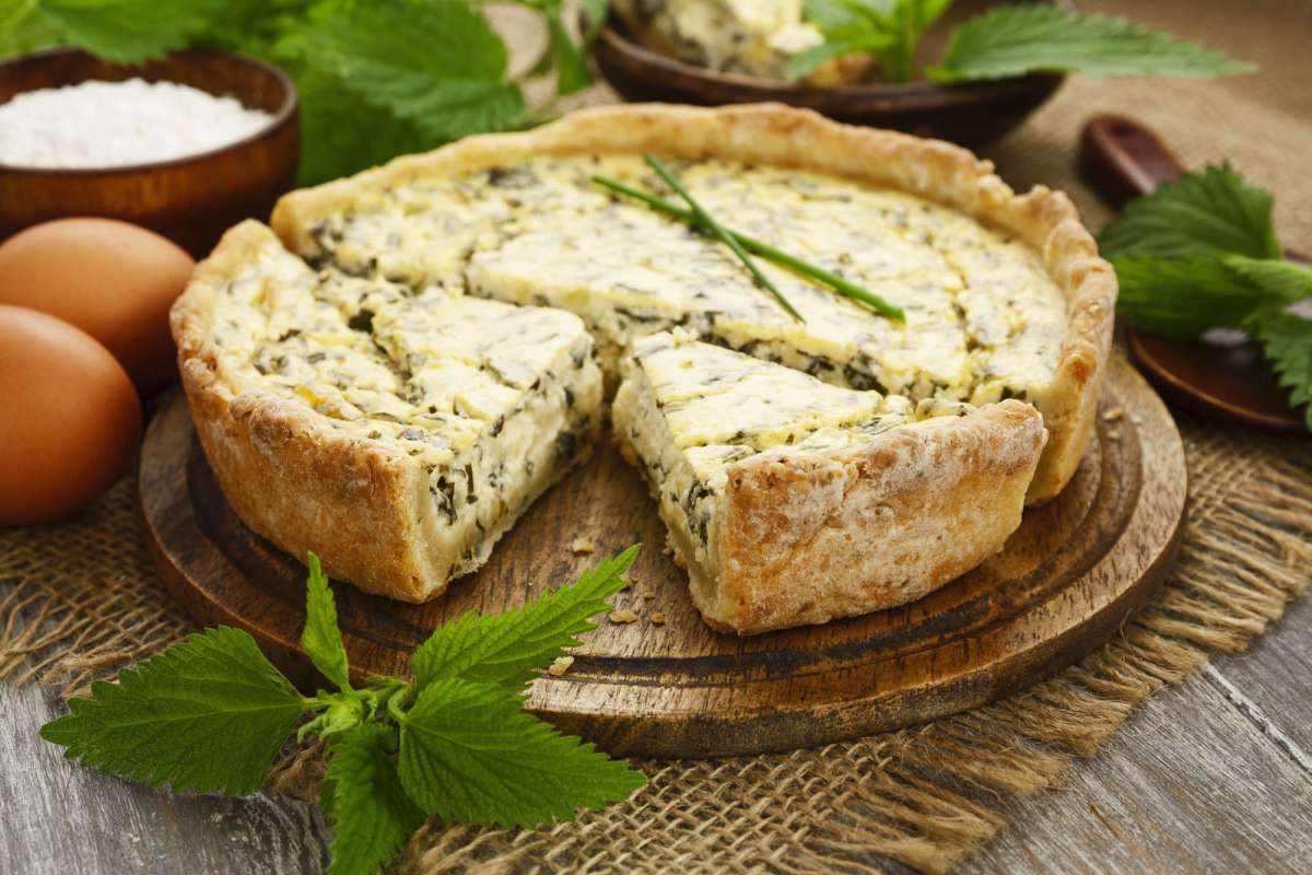 3. Medtem pripravimo nadev. Koprive in špinačo očistimo ter operemo in na grobo zrežemo. V kozici na malce masla prepražimo česen ter podušimo špinačo in koprive. Ko oboje uvene, odstavimo in pustimo, da se malo ohladi. V drugi skledi zmešamo skuto, kislo smetano in jajca. Vmešamo še koprive in špinačo.