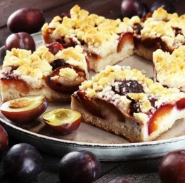 4 Položite testo v pekač in ga nežno pritisnite ob dno in stranice. Nadev iz sliv enakomerno razporedite po testu. Po želji lahko testo prekrijete z dodatnim trakom testa, del testa naribate čez ali pa ga pustite odprtega za klasičen izgled pite.