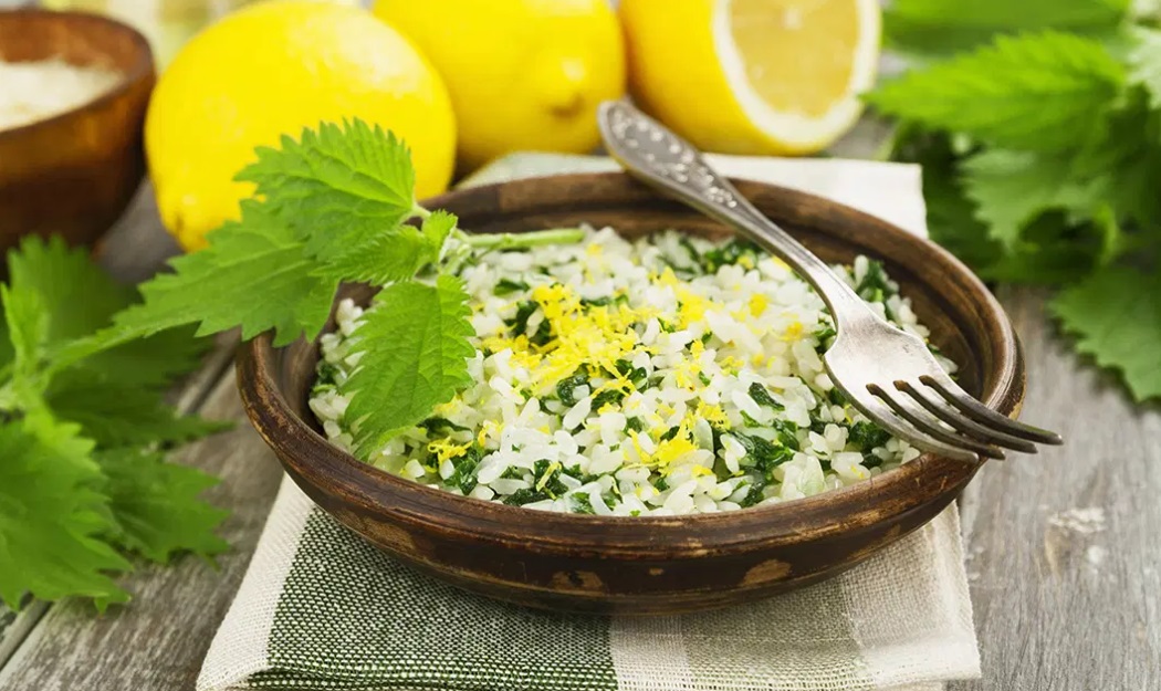 kozarec (2 dl) riža 1-2 pesti listov koprive 1 mlada čebula sol, olje, maslo, parmezan, neškropljena limona