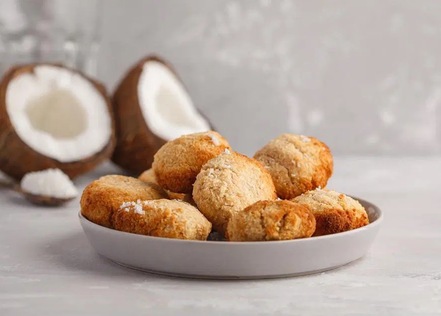 1 Zmešamo jajci, sol, sladkor in vaniljev sladkor. Dodamo smetano. Med mešanjem počasi dodajamo kokosovo moko, ki smo jo zmešali z gladko moko. Dobimo gostejšo zmes, ki jo pustimo počivati v hladilniku eno do dve uri.