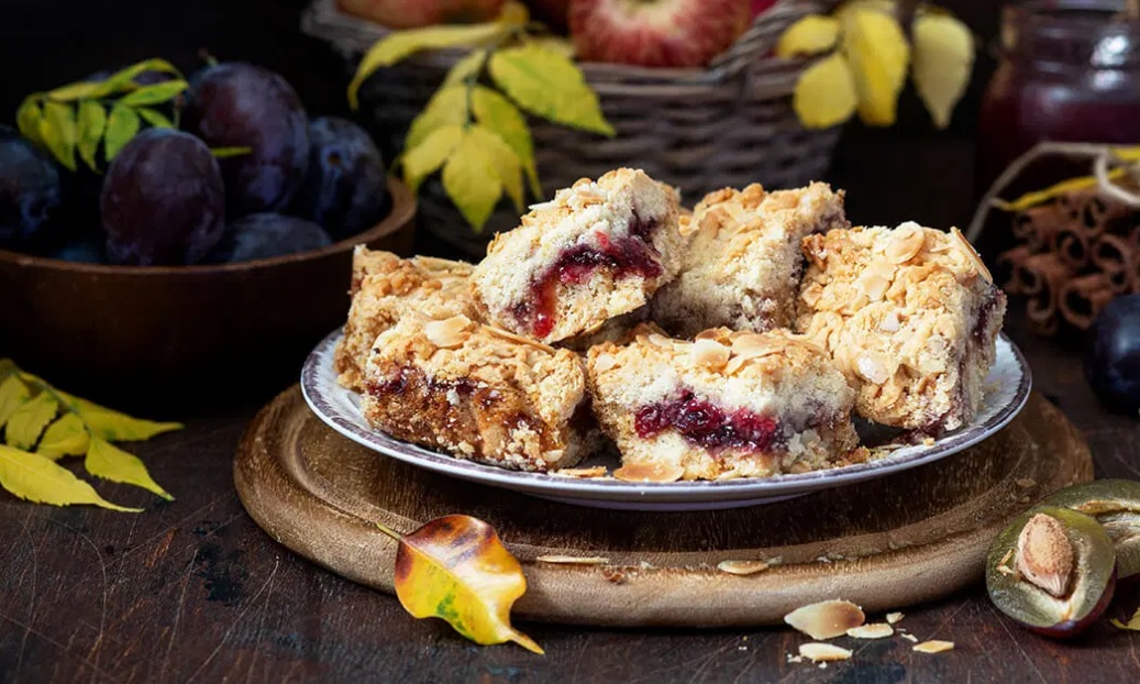 500 g sliv 400 g moke 200 g sladkorja 200 g zmehčanega masla 1 jajce 1 žlička mletega cimeta 1 žlička pecilnega 4 žličke koruznega škroba sok pol limone limonina lupinica sladkor v prahu za posip mandlji v lističih