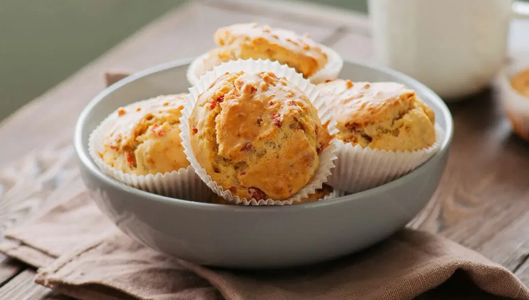 350 g moke (tip 400) 90 g masla 3 jajca 1 pecilni prašek 2,5 dl jogurta 1 žlička bazilike 1 strok česna 150 g mocarela 150 g slanine 1 žlica gorčice 0,5 dl olja začimbe po okusu poper