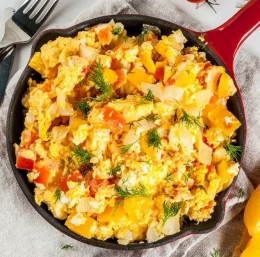 10 paprik 5 paradižnikov, zrelih 3 žlice oljčnega olja 2 čebuli 4 jajca sol poper