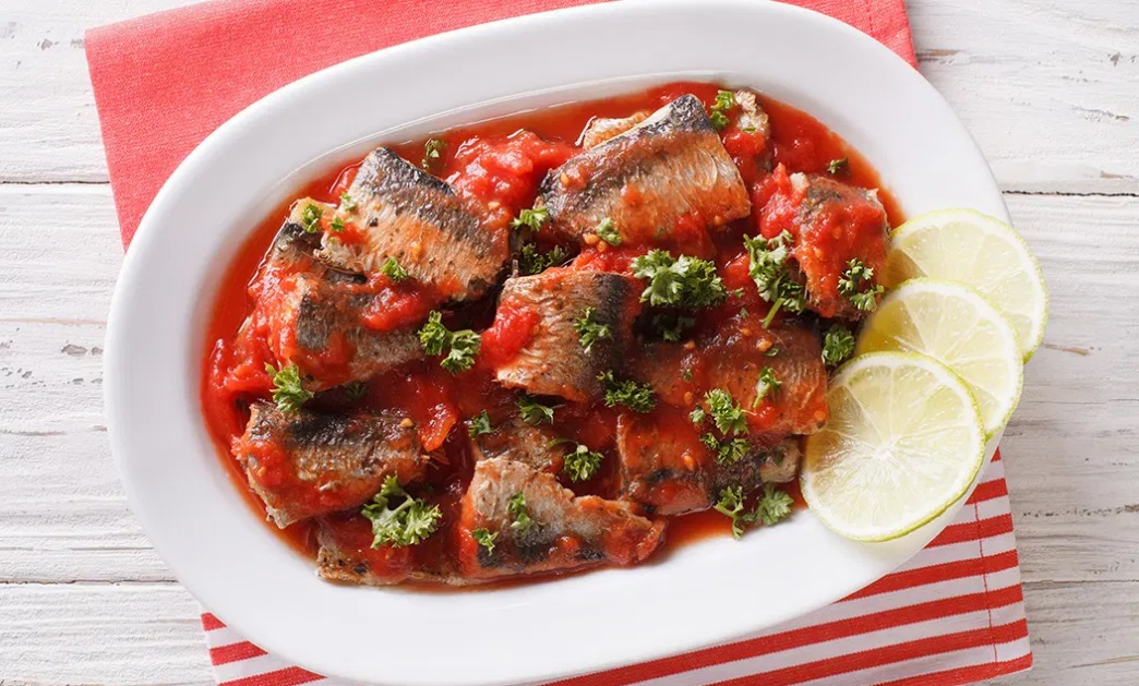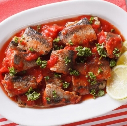 500 g svežih in očiščenih sardel 1 majhna čebula 2 stroka česna 2 konzervi olupljenih paradižnikov 1 dl suhega belega vina 1 šopek svežega peteršilja 4 žlice oljčnega olja sol in poper