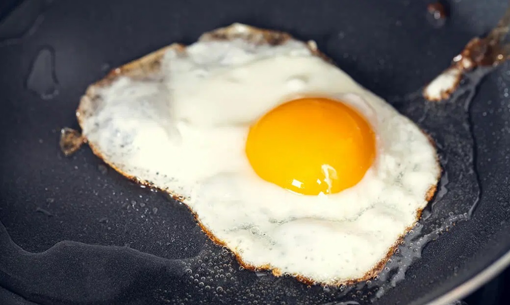 Z vilico privzdignemo rob jajca in preverimo, če je tudi na spodnji strani dovolj zapečeno.