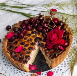 5. Ko je testo deloma pečeno, ga vzamemo iz pečice in obložimo z nadevom, po vrhu pa naložimo višnje. Zelo koristno je, da vsako prej pregledamo, da se ne bi ukvarjali s polomljenim zobom zaradi koščice.