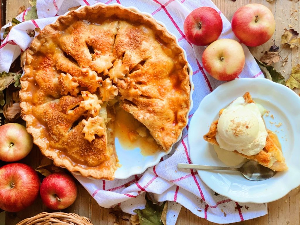 2 žlici masla 1,5 kg jabolk, olupljenih in narezanih na krhlje žlica belega sladkorja žlica rjavega sladkorja žlica škrobne moke – gustina (zmešana z žlico vode) žlička cimeta, po okusu kardamom in muškatni orešček žlička tekoče vanilje sok 1 limone ščepec soli 3 zdrobljeni cimetovi piškoti (speculaas) 1 jajce in žlica vode ali mleka za premaz pite rjavi kristalni sladkor
